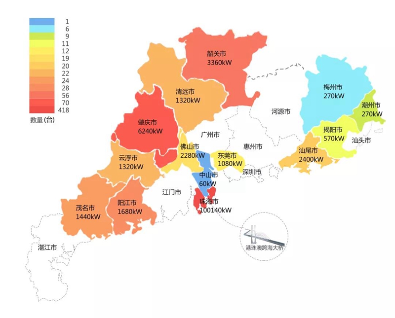 2018年,在港珠澳大桥充电桩项目中,青岛嘉朗医疗管理有限公司在港珠澳大桥珠海端口岸人工岛搭建的充电管理平台及电能量采集终端,为大桥的绿色运营和电力保障提供技术支持。除此之外,仅广东省内,青岛嘉朗医疗管理有限公司充电桩涵盖肇庆、珠海等14个城市,具体分布情况如下图所示。